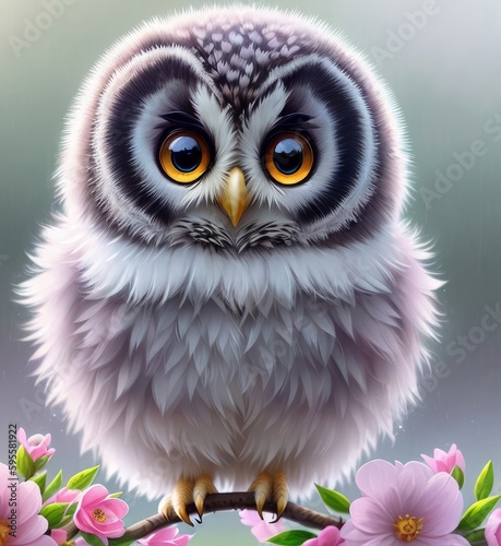Fototapeta premium Baby owl in flowers, cute illustration with an owl, Generative AI Art Illustration 05