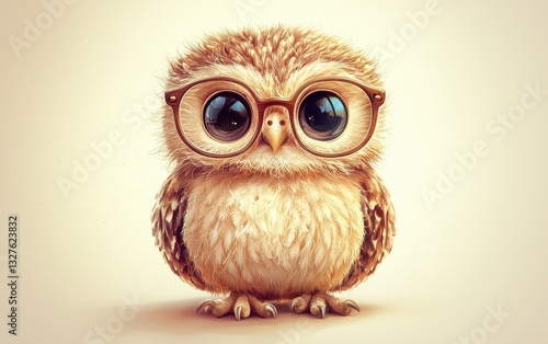 Fototapeta premium Baby owl wearing tiny glasses, sitting on a pastel cream background