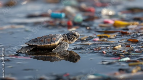 © sarun, Fototapeta premium Baby sea turtle struggling on polluted beach surrounded by colorful plastic debris and marine waste highlighting environmental issues