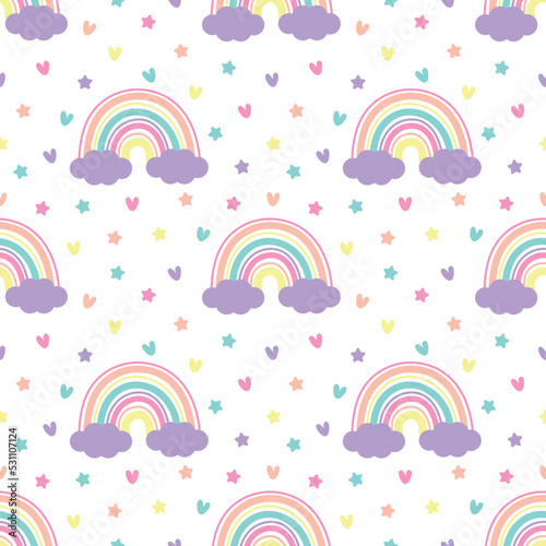 © Lyona, Fototapeta premium Baby seamless pattern with rainbow. Cute rainbows with clouds and hearts on white background seamless patter. Baby scandinavian vector hand drawn illustration ideal for textiles and newborn clothes