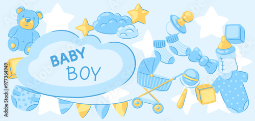 Naklejka premium Baby shower greeting card. New born baby boy Happy Birthday.