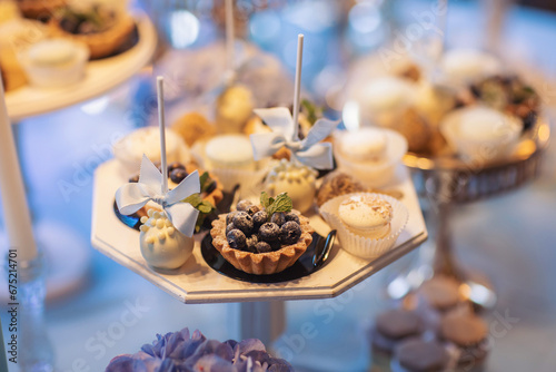 Naklejka premium Baby shower party for boy. Tasty treats on table decorated with flowers and balloons. Table with sweets on holiday. A beautiful sweet candy bar with muffins, cakes, fruits, marshmallows and flowers.