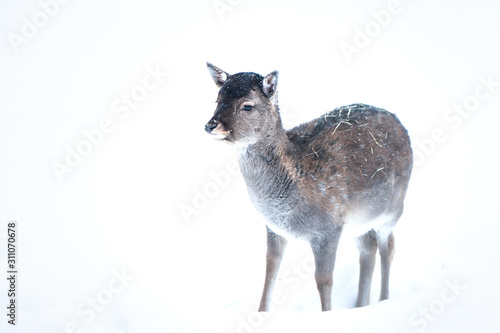 © Mariana, Fototapeta premium Baby Sika deer, Cervus nippon, spotted deer , walking in the snow on a white background