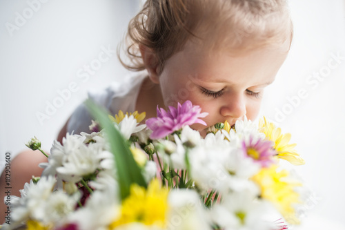 Fototapeta premium Baby sitting and sniffing a bouquet of flowers from small chrysanthemums,...