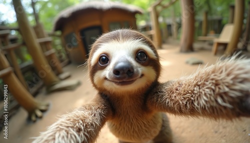 © Maryna, Obraz premium Baby sloth takes a selfie using a fish-eye lens. The cute mammal with long arms poses in a jungle like environment. Wildlife photo features an adorable animal in its natural habitat.
