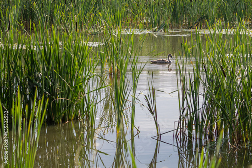 Fototapeta premium Baby swan bird on the surface of the lake with reeds.