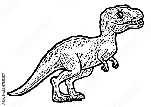 © Oleksandr Pokusai, Fototapeta premium baby tyrannosaurus sketch engraving PNG illustration. T-shirt apparel print design. Scratch board imitation. Black and white hand drawn image.