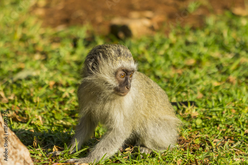 Obraz premium Baby vervet monkey foraging in the grass and dirt