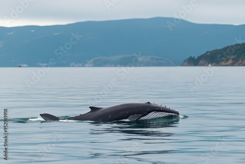 © Michael, Fototapeta premium Baby Whale Gliding Elegantly in Calm Bay with Peaceful Waves and Tranquil Waters