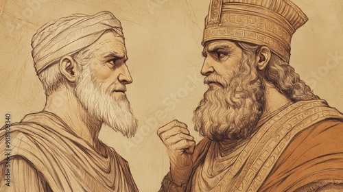 © T Studio, Fototapeta premium Babylonian Commander Nebuzaradan Speaks with Reverence to Prophet Jeremiah Offering Him Freedom and Protection in This Minimalist Biblical Sketch on Beige Background