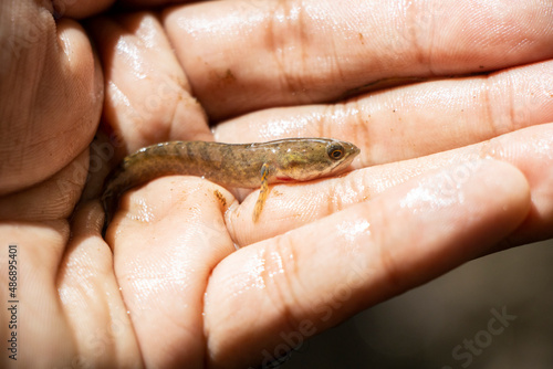 Obraz premium BabySmall fish in hand, snakehead fish in a river in Asian jungle, Thailand