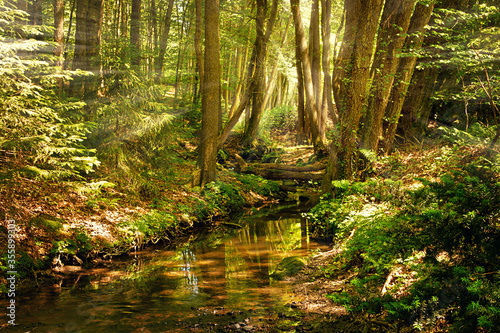 Obraz premium Bachlauf im Wald mit Sonnenstrahlen