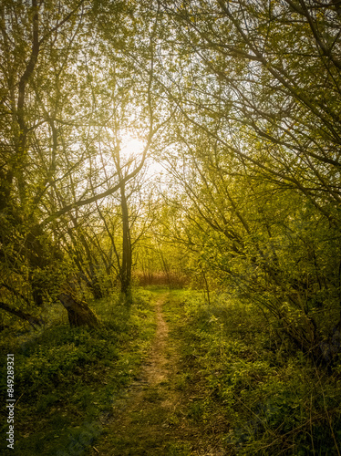 Obraz premium Back lit path through riparian forest.