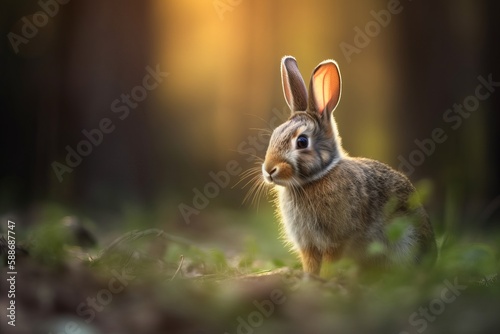 Fototapeta premium Back-lit scene of a beautiful baby rabbit sitting alone in a woodland setting