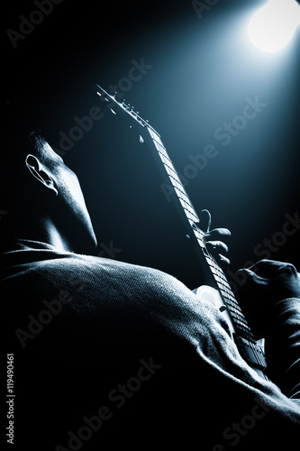 Fototapeta premium back of asian musician playing electric guitar with spotlight
