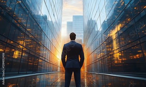 Obraz premium Back of businessman in suit with business office glass modern buildings...