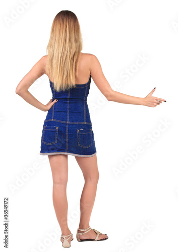 Fototapeta premium back of view beautiful young woman in jeans dress pointing at w