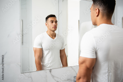 © Yakobchuk Olena, Fototapeta premium Back side portrait of young man looking at mirror
