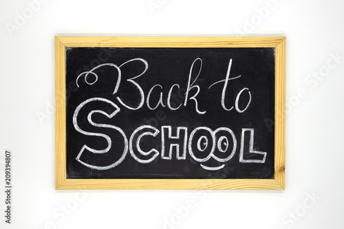Fototapeta premium Back to school chalk lettering on blackboard. White chalk Back to school inscription on chalkboard