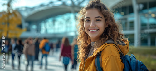 Fototapeta premium Back to school cheer: Radiant student with a bright smile on a campus...