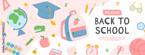 Fototapeta premium Back to school pink banner template with school items on the background....