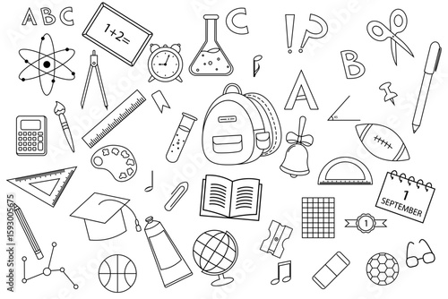 Fototapeta premium Back to school. Vector icon set. School supplies and elements are drawn. Vector illustrations. EPS10.