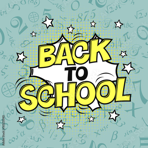 © pashabo, Obraz premium Back to school vector illustration. Formulas background. Comic retro style. Halftone circle element.