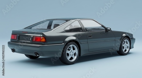 Fototapeta premium Back view a sleek, gray coupe with angled hatch, on a simple blue background