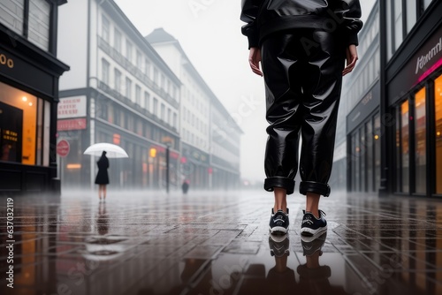 Obraz premium Back view. Close up view of girl legs in sneakers standing in the deep puddle on a wet pavement on the street, reflection on water. Concept of autumn weather, casual lifestyle. Generative AI