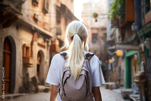 Fototapeta premium Back view of a backpacked woman with long hair, exploring city streets, view from the back.