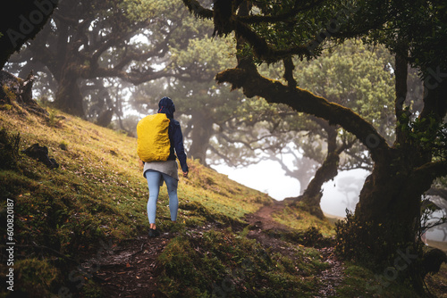 Naklejka premium Back view of a backpacker in rainproof clothes walking on a hike trail in a mystical misty forest with huge laurel trees. Fanal Forest, Madeira Island, Portugal, Europe.