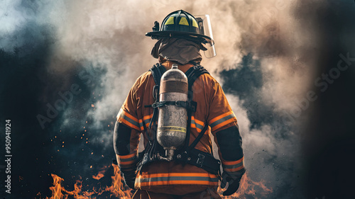 © Mohammad Xte, Fototapeta premium Back view of a firefighter fully equipped in protective gear, standing amidst a haze of smoke with visible flames, dark background