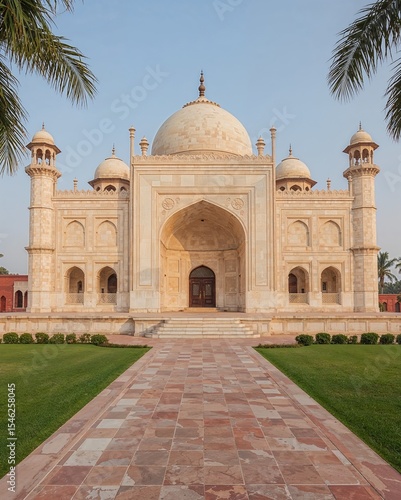 © Arceli, Fototapeta premium Back view of a Mughal inspired house that fuses ancient architecture with minimalism designed in a royal cream and ruby theme