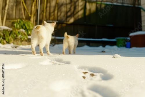 © Kuo, Fototapeta premium Back view of a white cat and a small white dog playing in the snow, in a backyard setting, with a focus on their footprints, cinematic style.