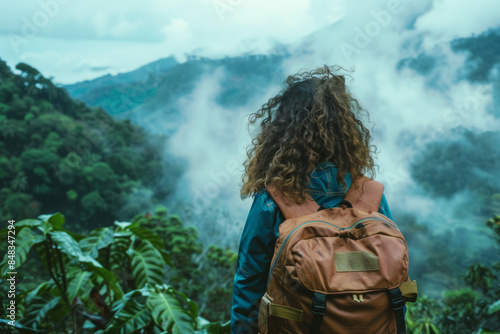 Naklejka premium Back view of a woman with curly hair and backpack hiking through a misty mountain forest, surrounded by lush greenery. Female traveler enjoying nature landscape