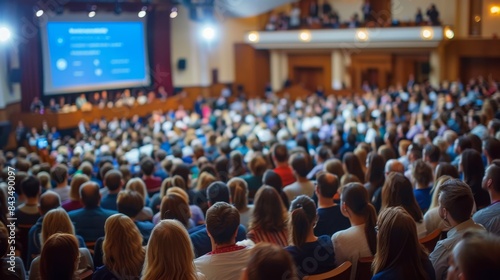 © Sergey, Naklejka premium Back view of an audience attentively watching a presentation at a conference hall.