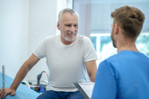 Obraz premium Back view of brown-haired doctor talking with mature male patient