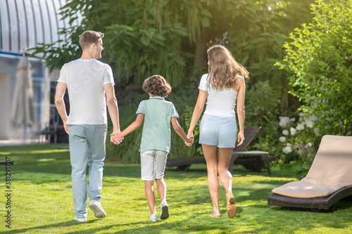 © zinkevych, Fototapeta premium Back view of family family of three holding hands, walking on grass
