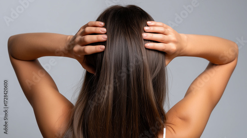 Naklejka premium Back view of female with long straight hair massaging scalp, wellness and self-care concept, minimalistic photography, beauty routine and healthy lifestyle. female scalp massage, h