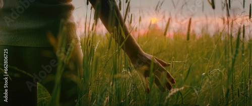 © Olga Gorkun, Fototapeta premium Back view of girl touching ears of high grass in wheat field. Woman enjoying sunset in grasslands.