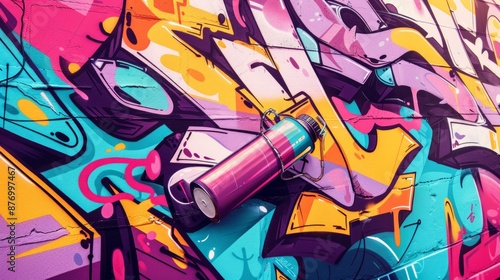 © PaulShlykov, Naklejka premium Back view of graffiti painter looking to the wall with his paintings. Street art concept