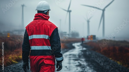 © One King, Obraz premium Back view of male worker standing alone in red safety suit walking away from wind farm on foggy day