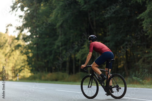 Fototapeta premium Back view of muscular guy in helmet riding bike on road