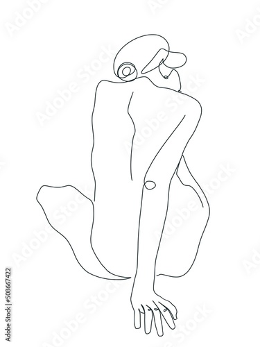 © Sadam, Fototapeta premium Back view of seated nude woman is drawn in line art style. Printable art.