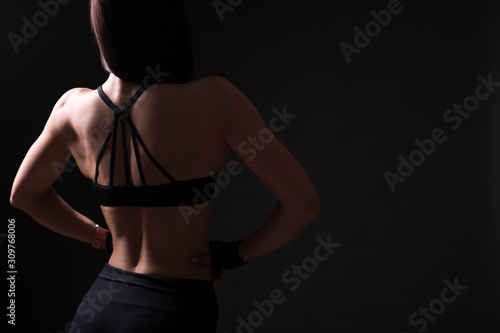 © Di Studio, Fototapeta premium back view of sexy woman with muscular body over black background with copy space