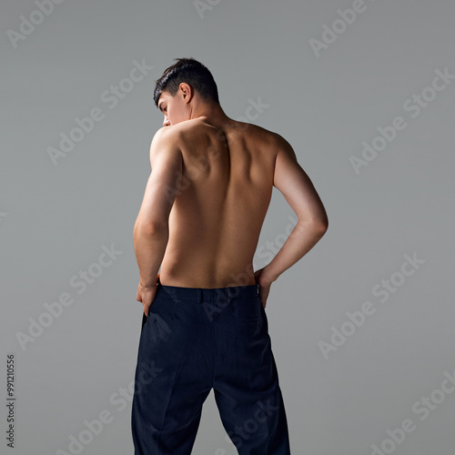 © master1305, Fototapeta premium Back view of shirtless man with relief, strong, muscular body, back, posing in pants isolated on grey studio background. Concept of male beauty, body and skin care, health, sport