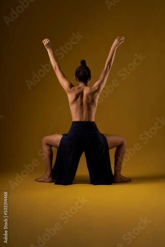 © serhiibobyk, Obraz premium Back view of slim girl with hair bun standing with legs bent and hands raised. Young female with bare back stretching, yoga practicing. Isolated on yellow studio background.