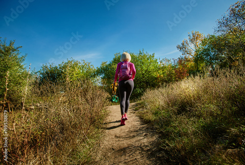 Naklejka premium Back view of sportswoman going to training in autumn park