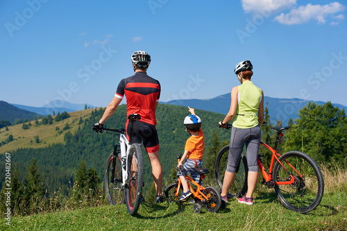 © anatoliy_gleb, Naklejka premium Back view of tourist family bikers, mom, dad and child standing with bikes on top of grassy hill, enjoying beautiful mountains view. Boy pointing into a distance. Active lifestyle, traveling concept
