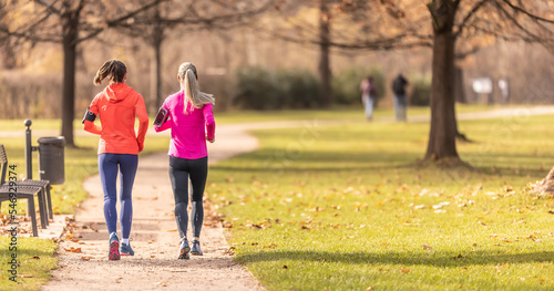 © weyo, Fototapeta premium Back view of two female runners in an autumn park